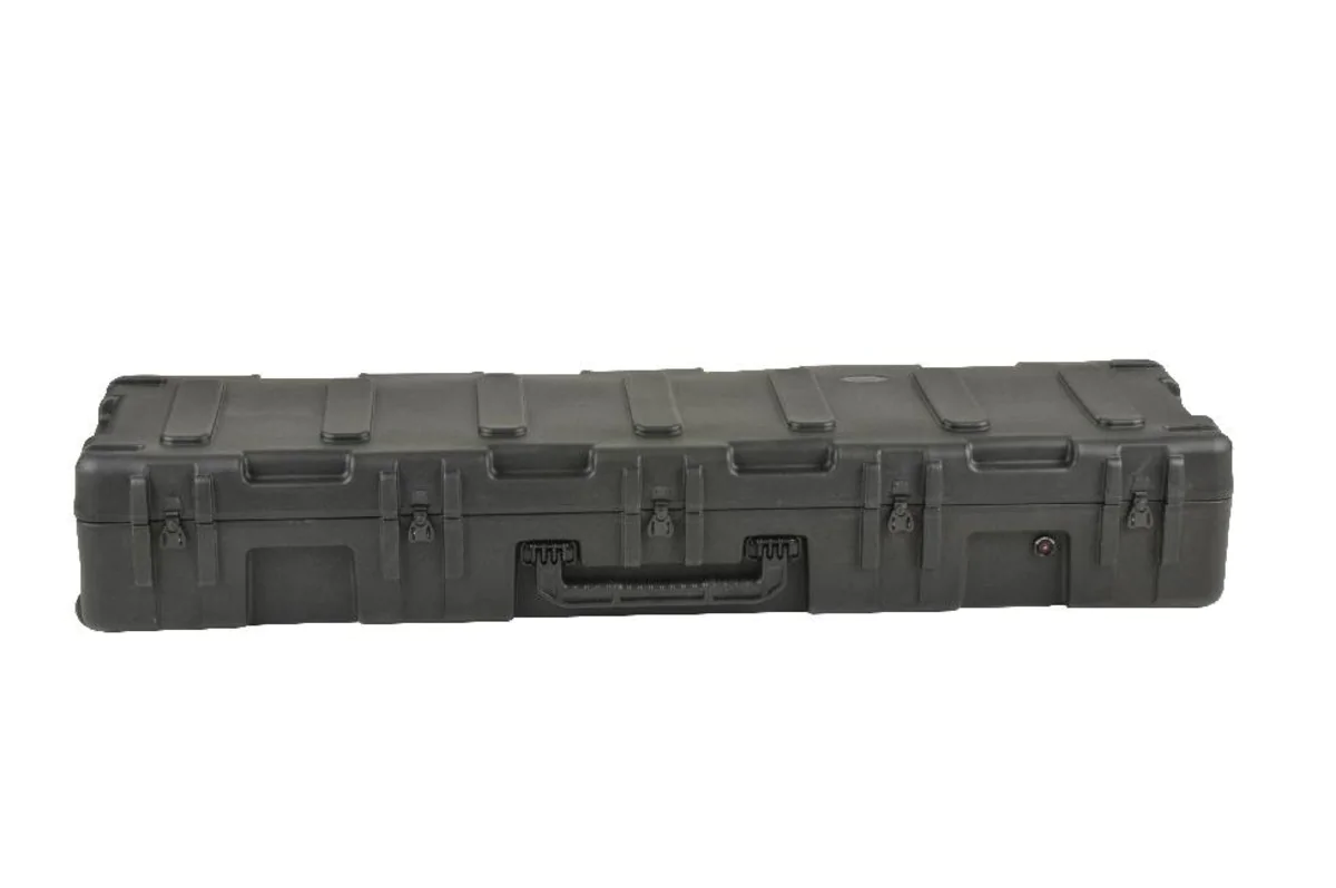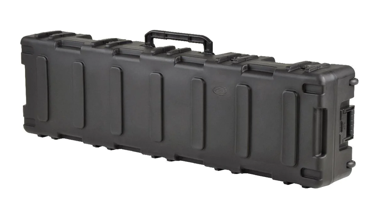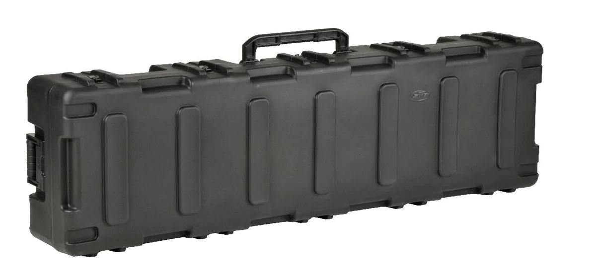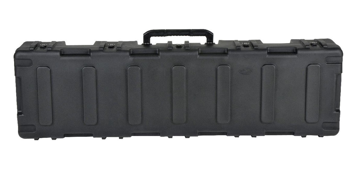 The SKB R Series Long Rifle / .50 Cal Case is roto molded of HDPE polyethylene for strength and durability. Convenient convoluted bunk bed style foam interior for accommodating two rifles. Molded in valance with gasketed seal and pressure equalization valve to comply with Military Standards making the case watertight and dust proof. Fits .50 Cal / Rifles up to 62" long. Roller blade style wheels for easy deployment. Injection molded oversized carrying handle and tow handle. Black powder coated stainless steel twist latches with locking hasps that will accommodate customer supplied locks or SKB's TSA Combination Padlock. Interlocking stacking ribs on the top and bottom for stability when stacked.