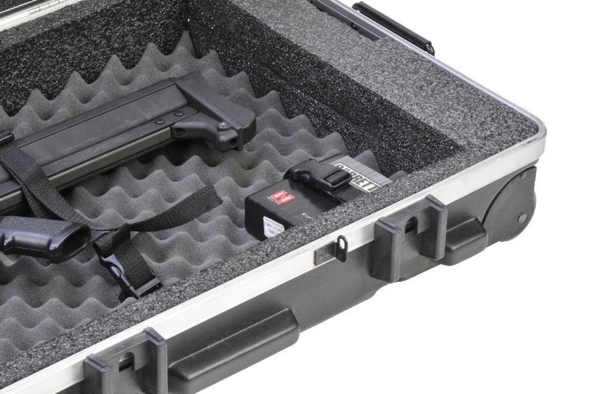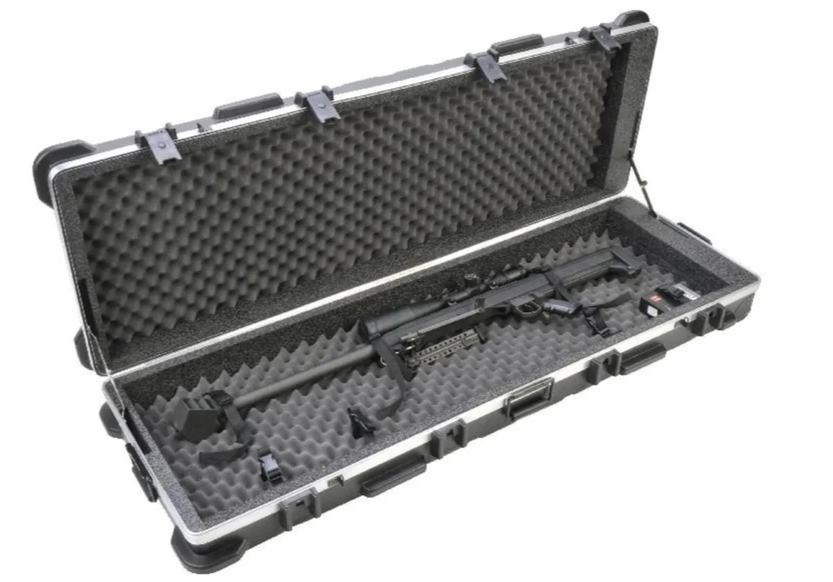 SKB Corporation has developed a new case to accommodate 50 Caliber rifles and all of the gear that is needed for a day at the range. Perfect for all Barrett 50 Cal Rifles (e.g. Barrett m82a1, Barrett m107, Barrett m95, etc).The new 2SKB-6019 ATA 50 Caliber Case is a polyethylene molded shell with weather resistant 0-ring seal for moisture protection and features SKB's bumper protected patented trigger release latches and locking hasps for a customer supplied lock.The interior of the case measures 56" L x 17" W x 5" D and features a high density PE and convoluted foam interior for cushioned protection with three sets of nylon cinch strap tie downs for gun securement. SKB's design engineers even provided four sets of cinch strap tie downs to secure boxes of shells, extra clips and bi-pod with plenty of room to store extra gear when traveling to a shoot. Comfortable spring loaded handles and wide-tracking wheels provide for easy transport of your 50 caliber equipment. The case color runs through the material so scratches are invisible and the "poly" is impervious to all solvents, oils, fuels and acids.This case also exceeds ATA specification 300 category 1, the highest standard for an airline transport container (a minimum of the 100 trips by air).This case is covered under SKB's Unconditional Lifetime Warranty as well as the $1500 content coverage if your gun is damaged by the airlines.