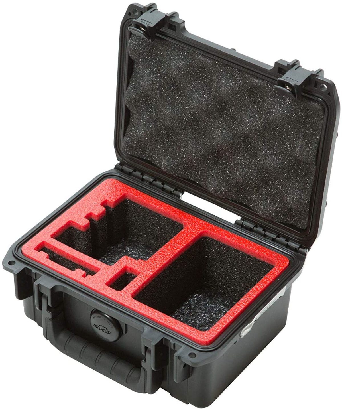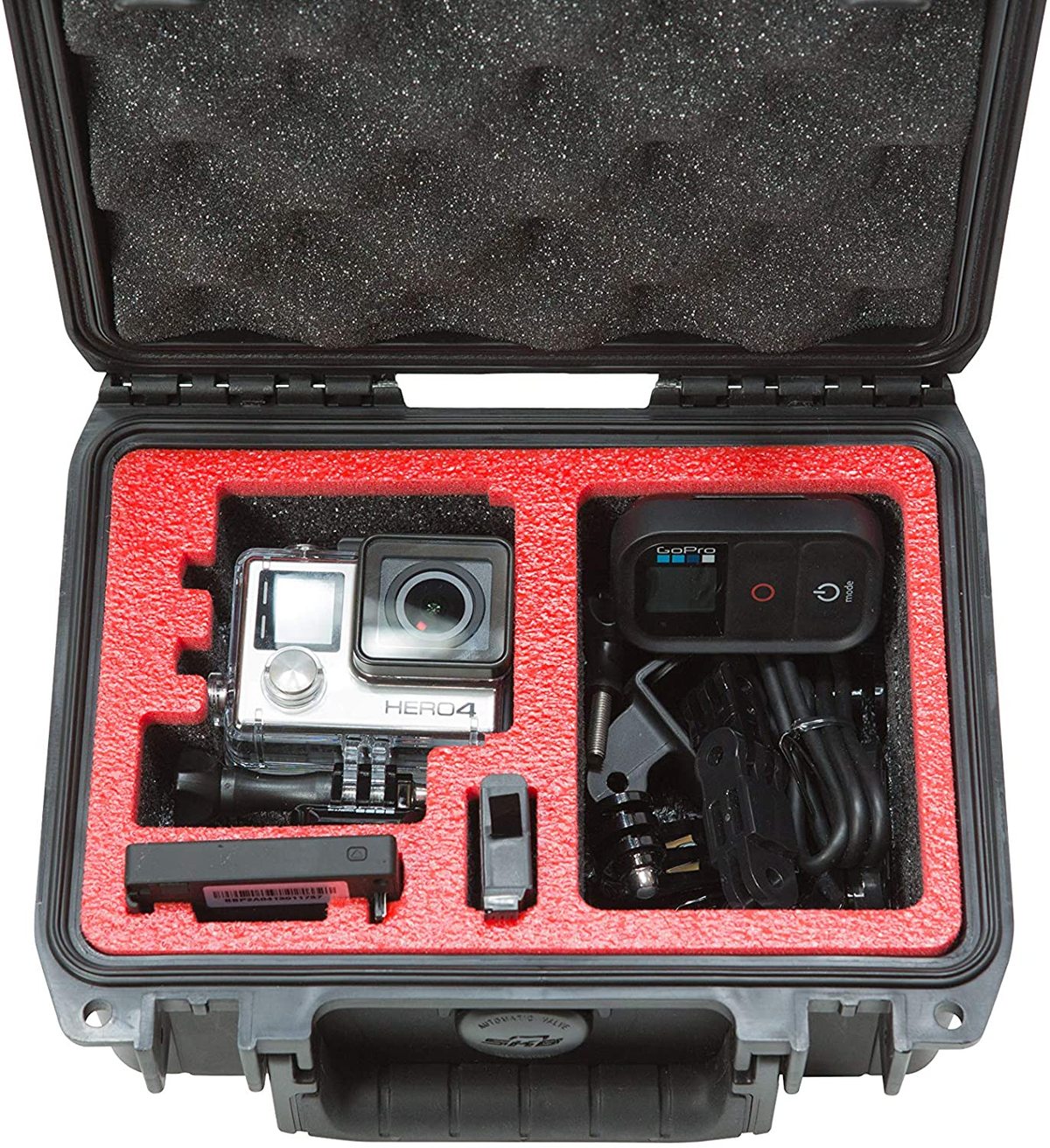 The 3i-0705-3GP1 features a custom cut foam interior that will accommodate any generation of a GoPro camera up to the Hero 4 version and includes a storage compartment for accessories as well as slots for batteries. The foam interior is constructed of a high quality Stratocell foam with a contrasting red capped foam.iSeries injection molded waterproof cases are constructed of ultra high-strength polypropylene copolymer resin and feature a gasketed, waterproof and airtight, submersible design (IP67) that is resistant to corrosion and impact damage. Its molded-in hinges, patented " mini trigger release" latch system, comfortable, snap-down rubber over-molded cushion grip handle, secure stacking, and automatic ambient pressure equalization valve (MIL-STD-648C) all contribute to its military grade design.