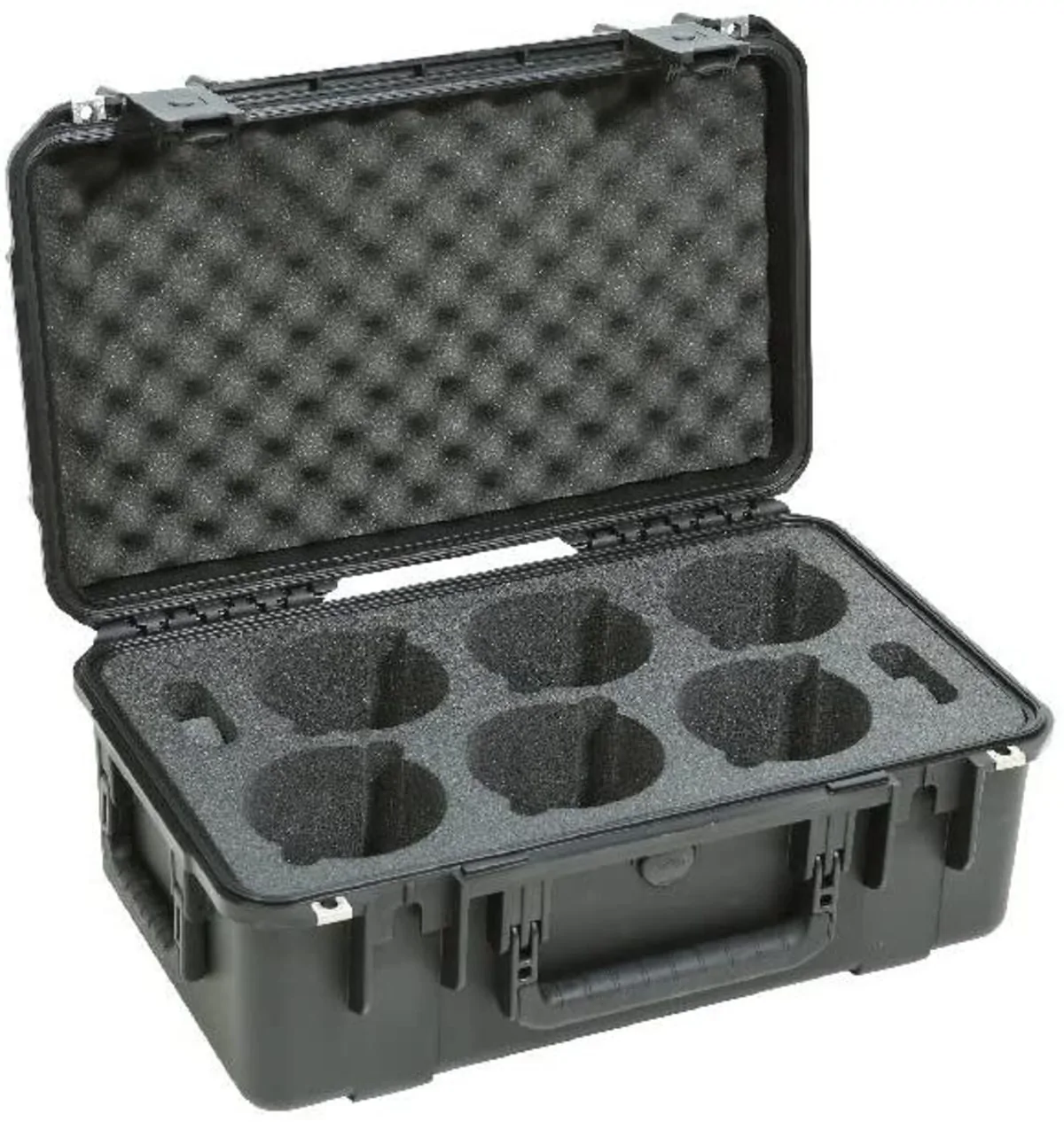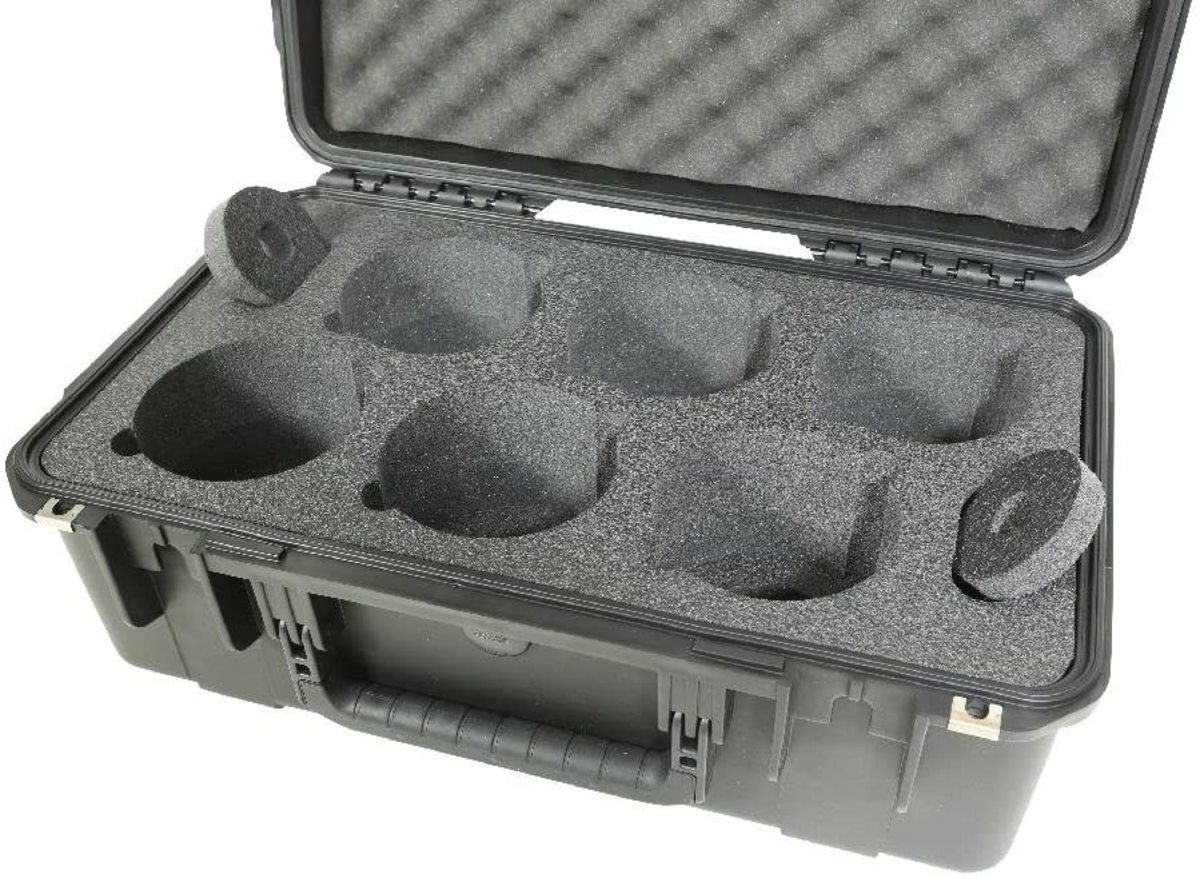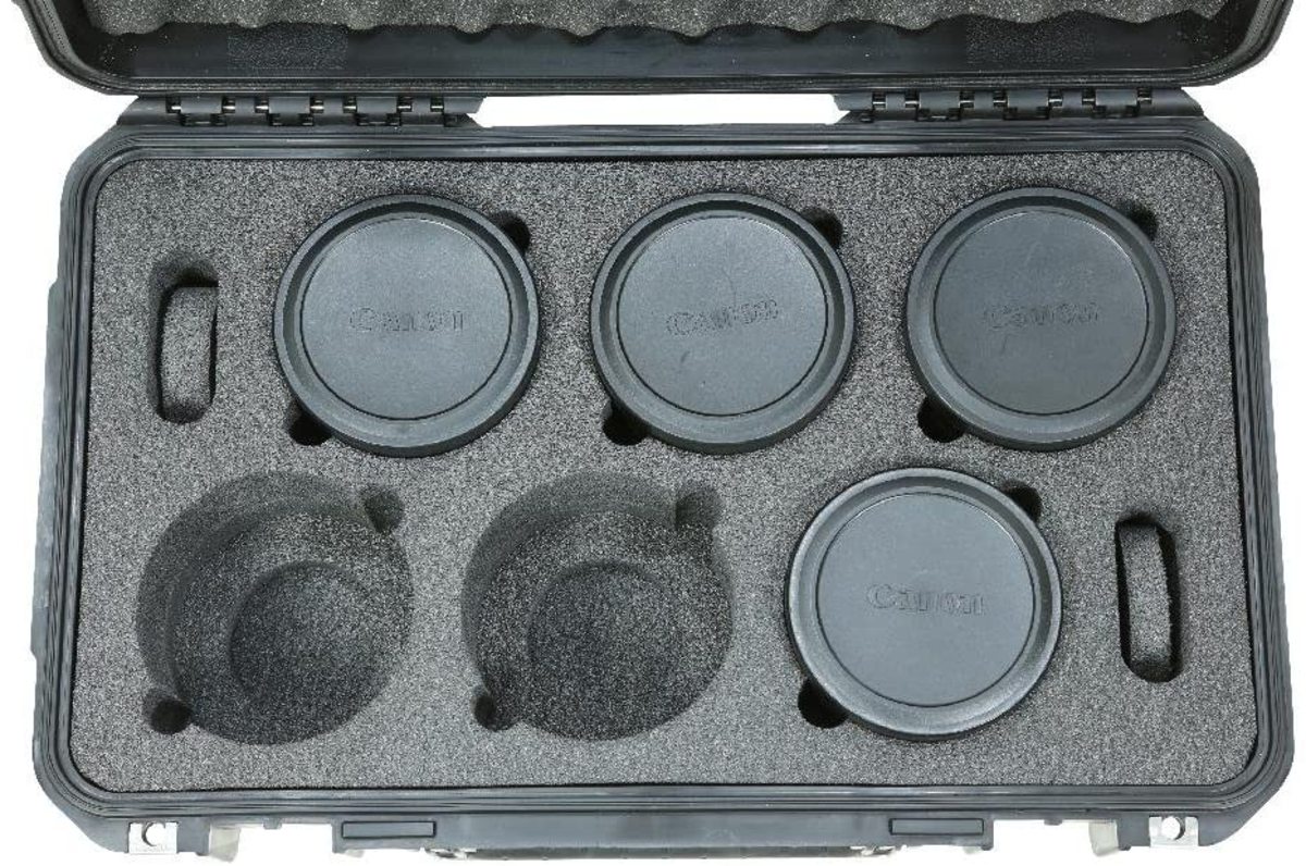 The iSeries 20118LENS Case (3i-20118LENS) case is the perfect companion case for the professional photographer. This case will hold six lenses such as the Canon Cinema Prime Lenses or Schneider Kreunznach Xenon FF Prime Lenses. Each lens slot has a diameter of 125mm and the base depth of each lens slot is a total of 120mm. The useable lid depth is 35mm creating a maximum length of 125mm per lens. There are two removable foam discs provided to change the internal base lens height to 97mm instead of the 120mm when needed. This case is the maximum approved size for airline carry on travel.This iSeries Lens Case, (3i-20118LENS) has trigger release latches for quick but secure access. This custom waterproof case is made in the USA and is backed by SKB's Unconditional Lifetime Warranty.About our iSeries SKB's iSeries injection molded waterproof cases are constructed of ultra high-strength polypropylene copolymer resin and feature a gasketed, waterproof, submersible design (IP67) that is resistant to corrosion and impact damage. Its continuous molded-in hinge, patented "trigger release" latch system, comfortable, snap-down rubber over-molded cushion grip handle, secure stacking, and automatic ambient pressure equalization valve (MIL-STD-648C) all contribute to its military grade design