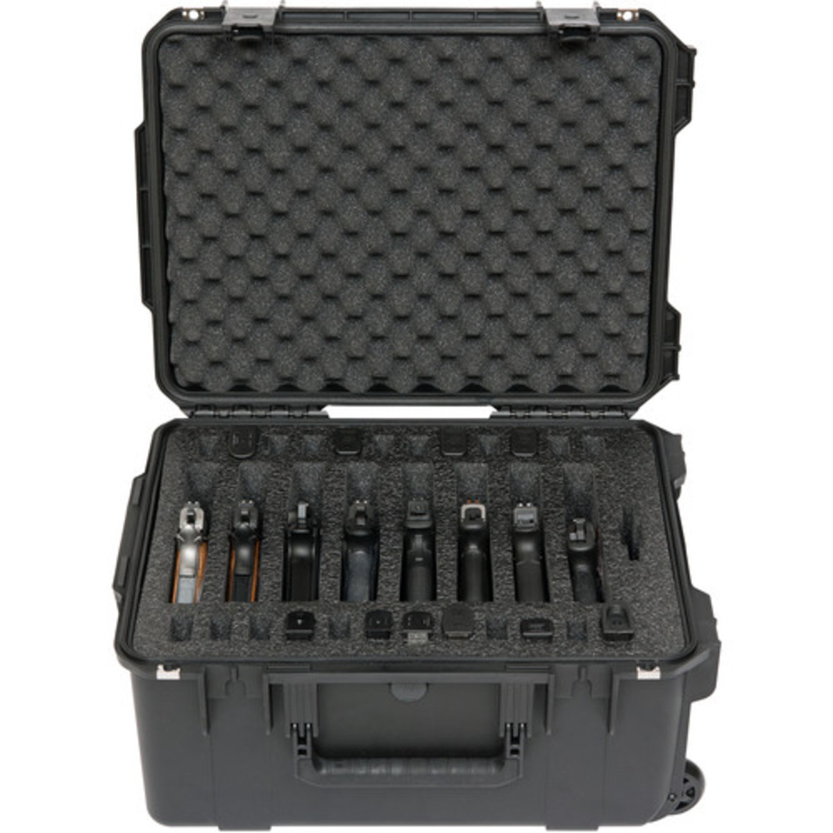 The iSeries 2015-10 Eight Handgun Case is an injection molded, watertight case featuring a customized high density 2lb closed cell foam interior that accommodates eight handguns with designated slots for twenty-four magazines and other accessories. The eight-handgun case features wheels and a pull handle for easy towing, and is a great transport solution for sport enthusiasts, law enforcement, and military personnel alike. The 3i-2015-10B-M is made of ultra high-strength polypropylene copolymer resin, material specified by the U.S. military for cases and containers. It features a gasket-sealed, water and dust-tight submersible design, meeting military standard MIL-C-4150J. The automatic ambient pressure equalization valve self-regulates for different altitudes meeting military standards MIL-STD-648C and IP67. It is resistent to UV, solvents, corrosion, fungus and impact damage, surpassing military standard MIL-STD-810F. The case features a continuous molded-in hinge with a stainless steel pin, a patented "trigger release" latch system, and a comfortable, snap-down, rubber over-molded handle. The 3i-2015-10B-M is comfortable and durable in transport and secure and stable in storage thanks to SKB's interlocking case design. With two padlockable eyelets, the 3I-2015-10B-M is completely secure