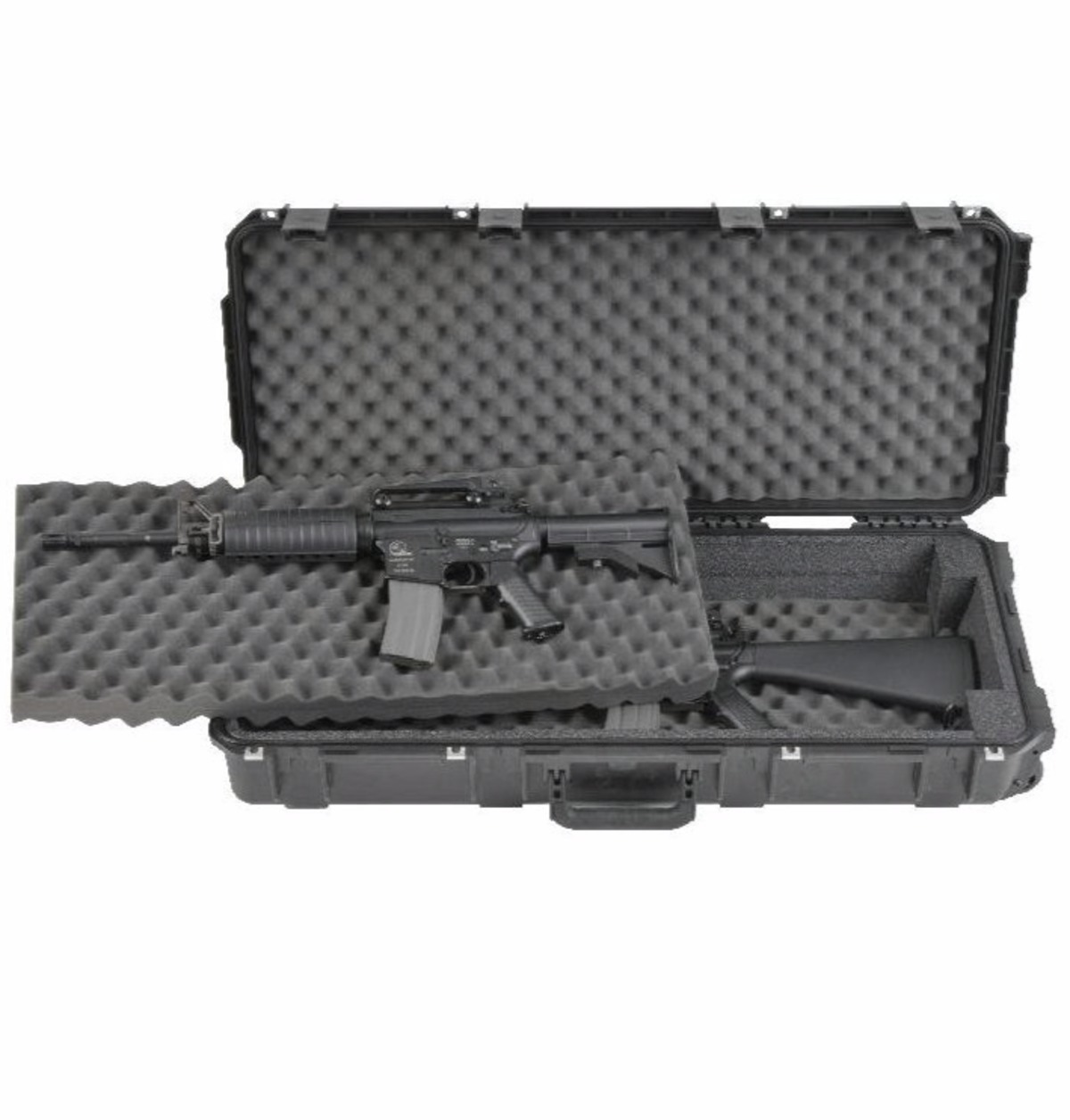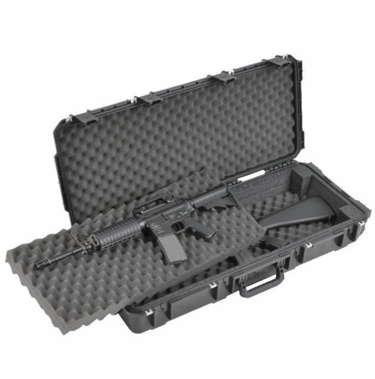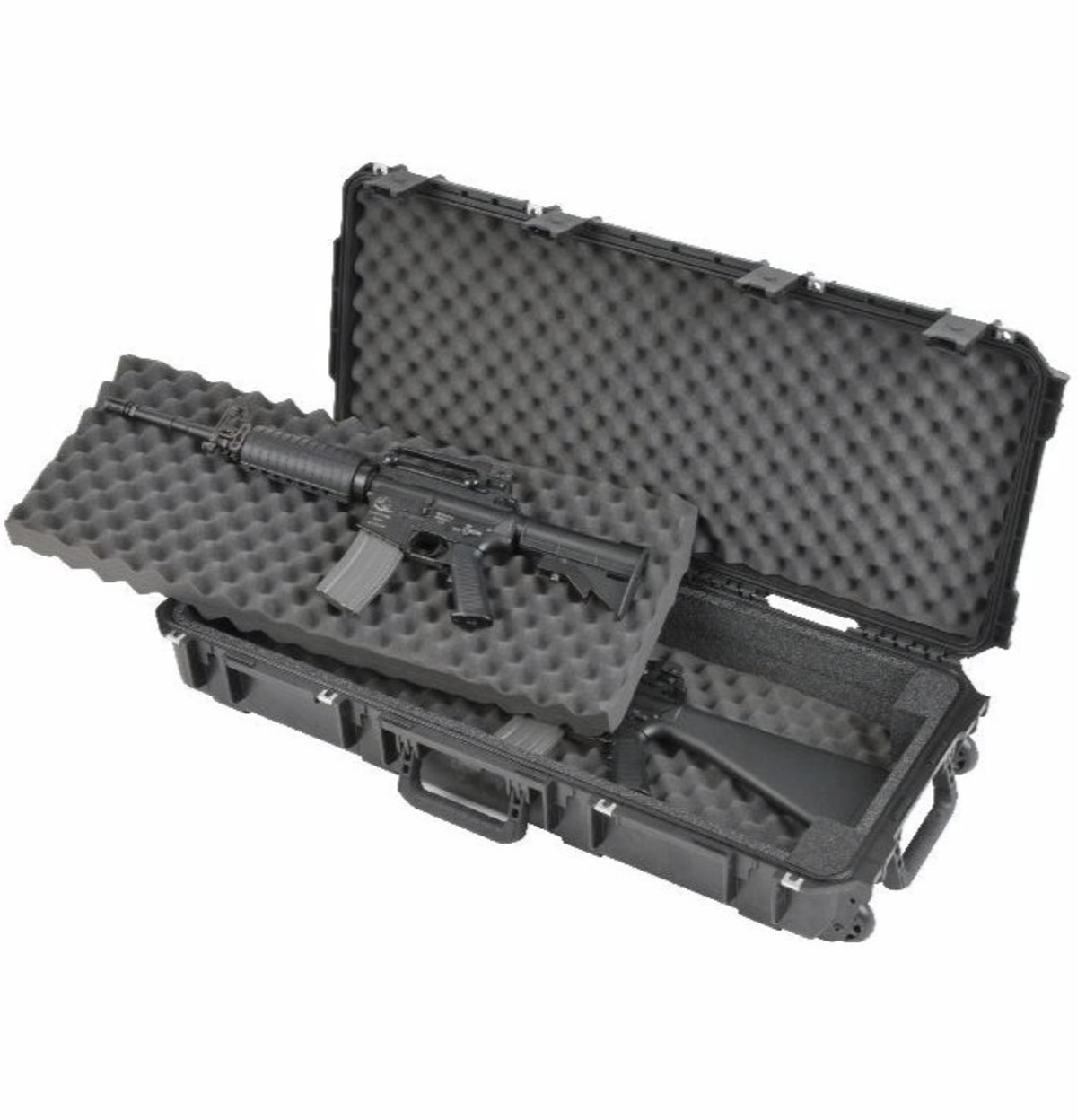 The iSeries 3614- Double M4 / Short Rifle Case (3I-3614-DR) offers the maximum in protection for two short rifles or M4 style rifles with a rigid foam bunk-bed system for protection and stable positioning and convoluted foam in the lid for securing and cushioning of your gear. SKB iSeries Injection Molded Mil-Standard Waterproof Cases are molded of ultra high-strength polypropylene copolymer resin, featuring a gasketed, water and dust tight, submersible design (MIL-C-4150J) that is resistant to corrosion and impact damage. Features a molded-in hinge, patent pending "trigger release" latch system, comfortable, snap-down rubber over-molded cushion grip handle, automatic ambient pressure equalization valve (MIL-STD-648C), resistance to UV, solvents, corrosion, fungus and impact damage (MIL-STD-810F).