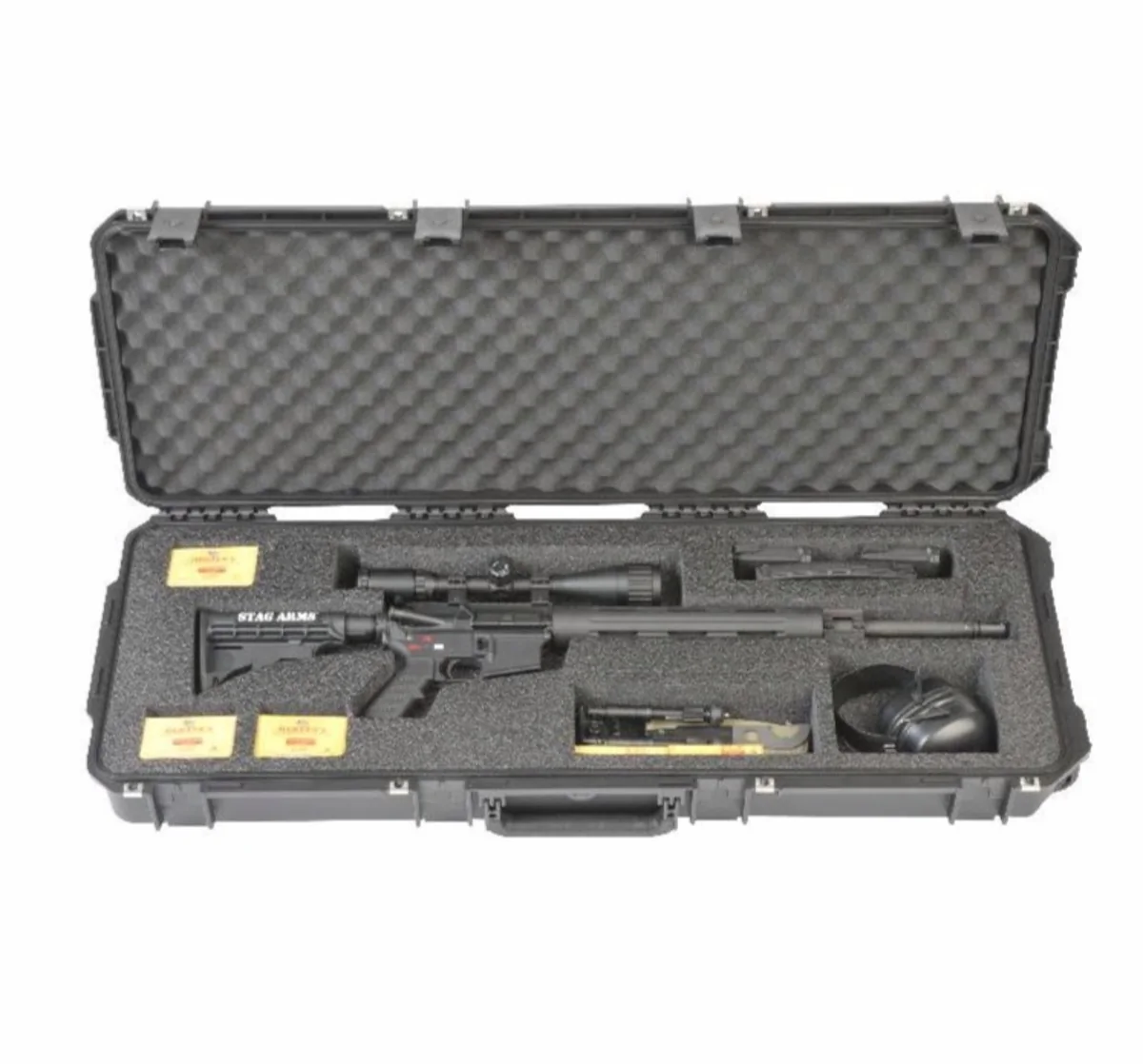 The iSeries 4214 AR Rifle Case is an injection molded watertight case with wheels that features a custom cut, high-density foam interior and is perfect for shorter, tactical, assault type rifles.The interior features a heavy-duty 2 Lb. density closed-cell, recyclable foam with 7 separate cavities to securely hold your AR and all your accessories. The AR cavity has adjustable pull-out foam plugs to accommodate overall lengths up to 41". The area around the scope also has adjustable pull-out foam plugs to accommodate various scope sizes.All SKB iSeries Injection Molded Mil-Standard Waterproof Cases are molded of ultra high-strength polypropylene copolymer resin, featuring a gasketed, water and dust tight, submersible design (MIL-C-4150J) that is resistant to corrosion and impact damage. Features a molded-in hinge, patented "trigger release" latch system, comfortable, snap-down rubber over-molded cushion grip handle, automatic ambient pressure equalization valve (MIL-STD-648C), resistance to UV, solvents, corrosion, fungus and impact damage (MIL-STD-810F).