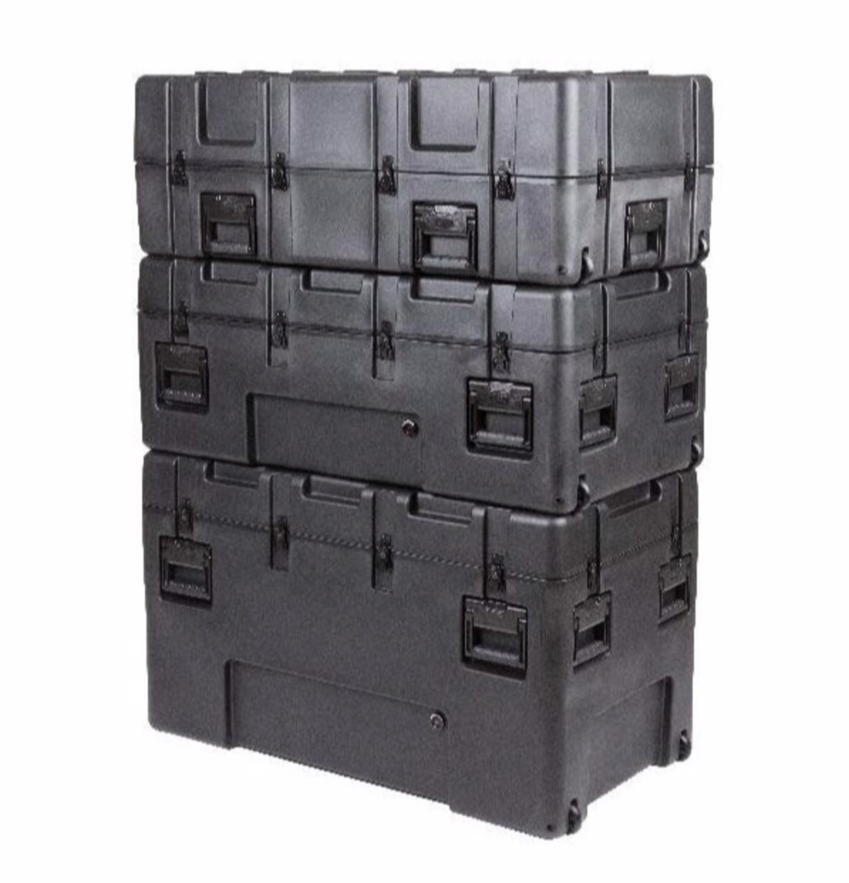 These Mil-Standard cases were designed to meet the most demanding military specifications. They are roto-molded for strength and durability, airtight and water proof with solid stainless steel latches and hinges that will withstand the most demanding shipping conditions.The 3R Mil-Std. Cases are molded of (LLDPE) polyethylene impact resistant / UV stabilized material and meet or exceed MIL-STD 810 and MIL-C-4150J specifications.The shipping cases are all available with an empty interior while some models are available with: cubed foam, layered foam, padded dividers, and a pull handle with wheels.Wheel options vary by case.